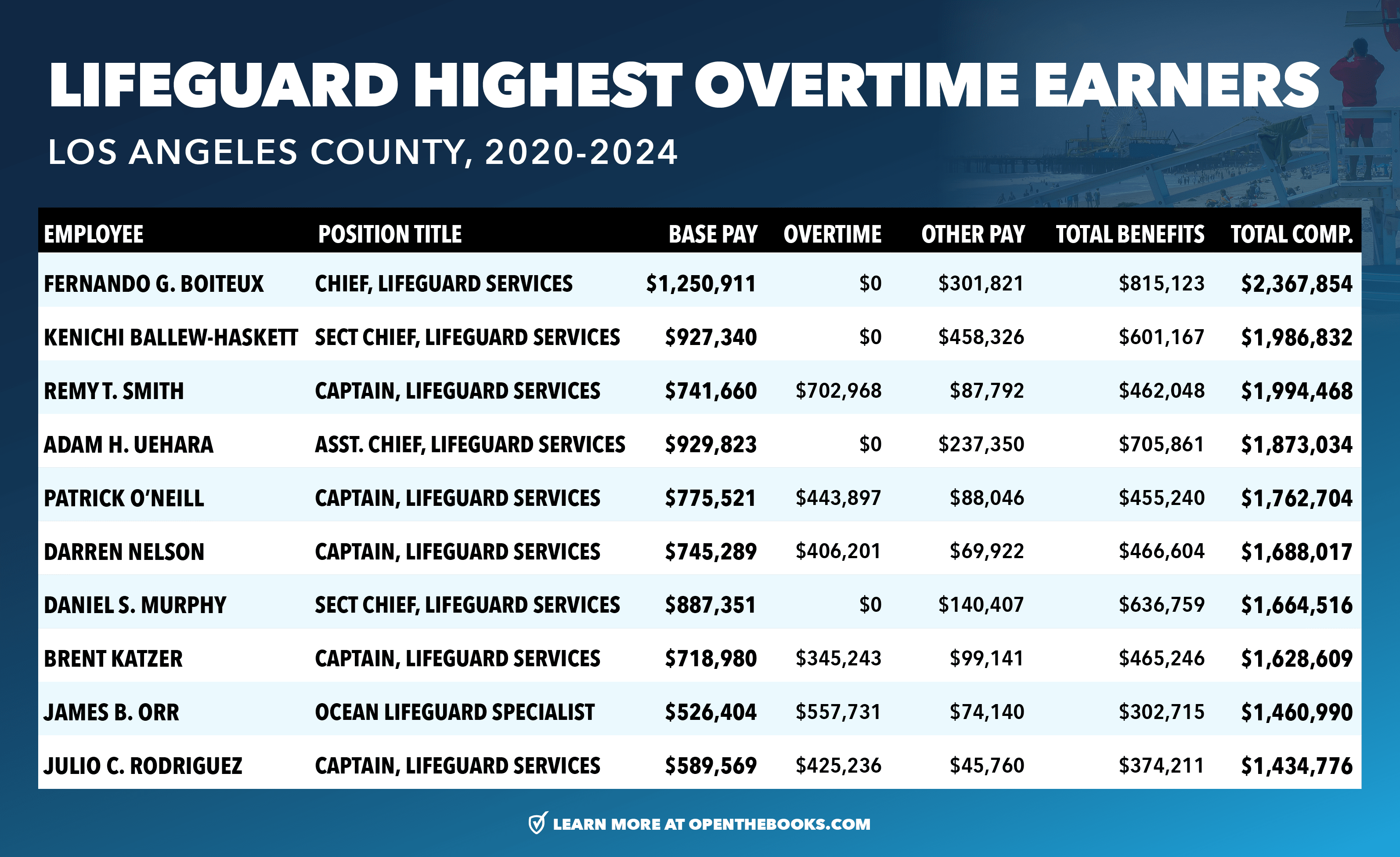 In fact, the highest paid overtime earner at $171,000 was lifeguard services captain Remy Smith, who also received $109,999 worth of benefits, for a total compensation package of $468,556, the second highest compensation package behind Boiteux.