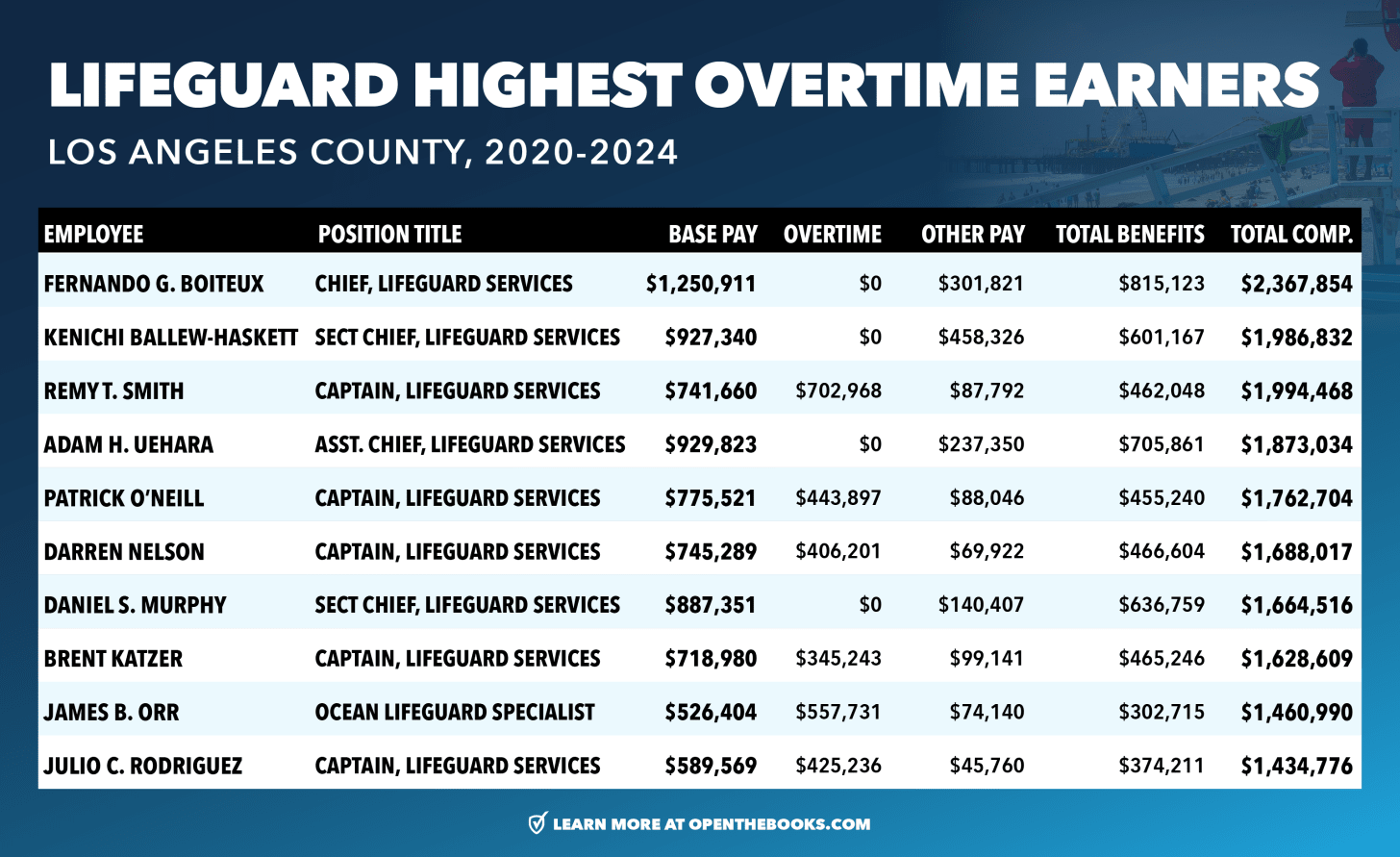 When we combine overtime with base pay and other compensation, the highest paid lifeguards in the last five years each took home between $1.4 million and $2.4 million in total compensation: