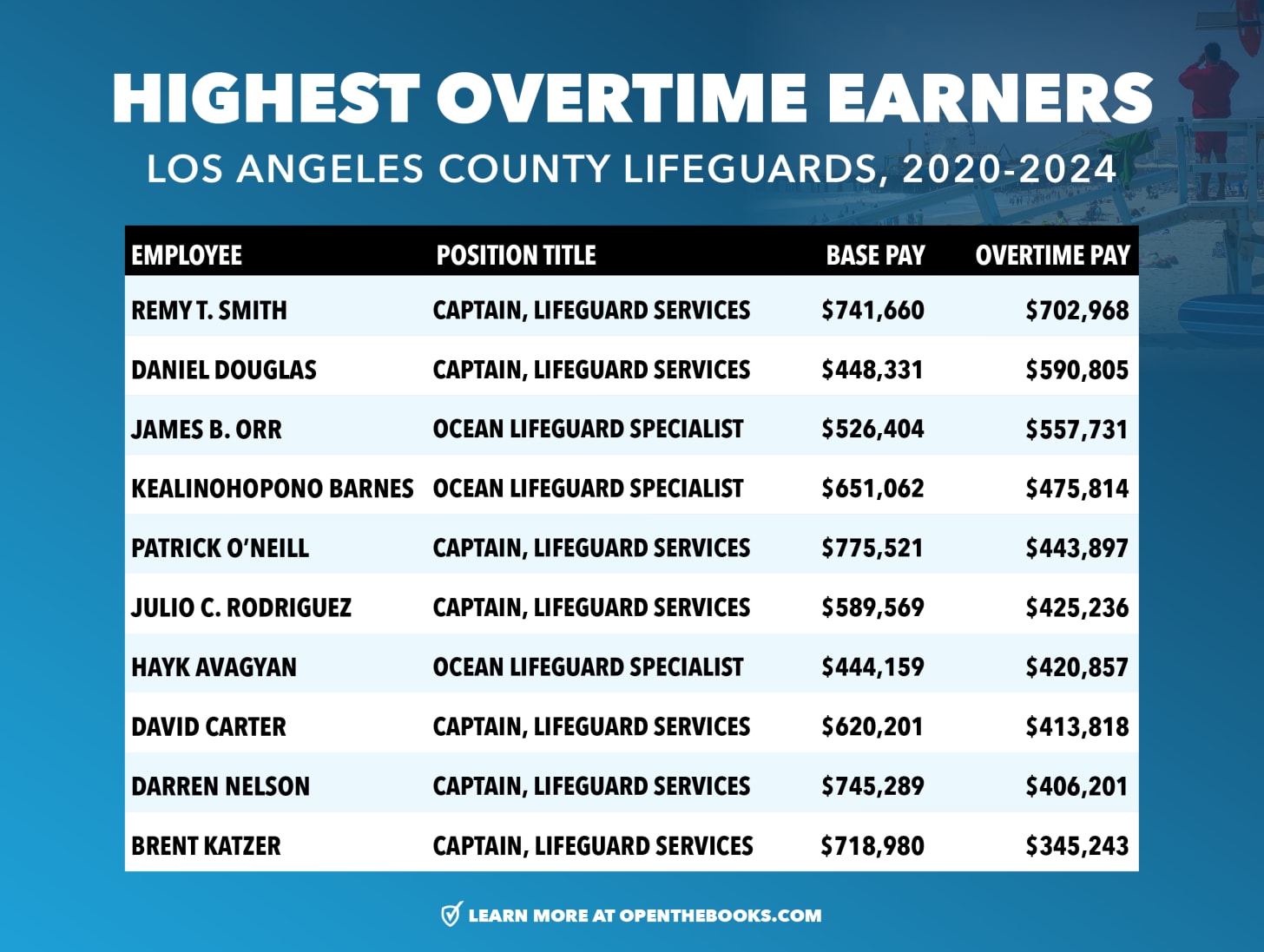 Following Smith, the next highest overtime earners are ocean lifeguard Hayk Avagyan ($147,872), lifeguard services captain Colby Trivette ($137,139), lifeguard services captain Julio Rodriguez ($132,490) and ocean lifeguard Scott Deboer ($128,873).