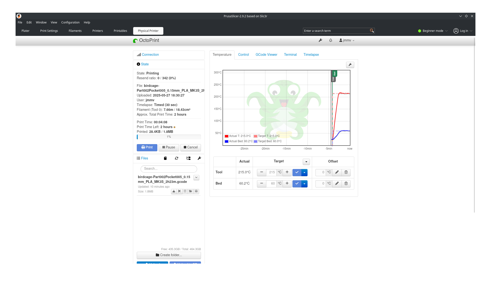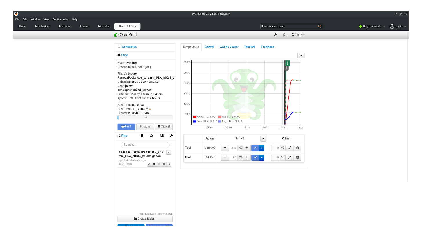 OctoPrint itself is “the CUPS of 3D printing”. It’s a piece of software that knows how to send the G-Code to the printer via its USB connection, but it’s also a system that queues print jobs, provides monitoring and G-Code inspection features, allows for timelapse recording via a webcam, and much more. It feels overkill to be honest, but it does the job and there don’t seem to be any simpler alternatives, so that’s what it is.