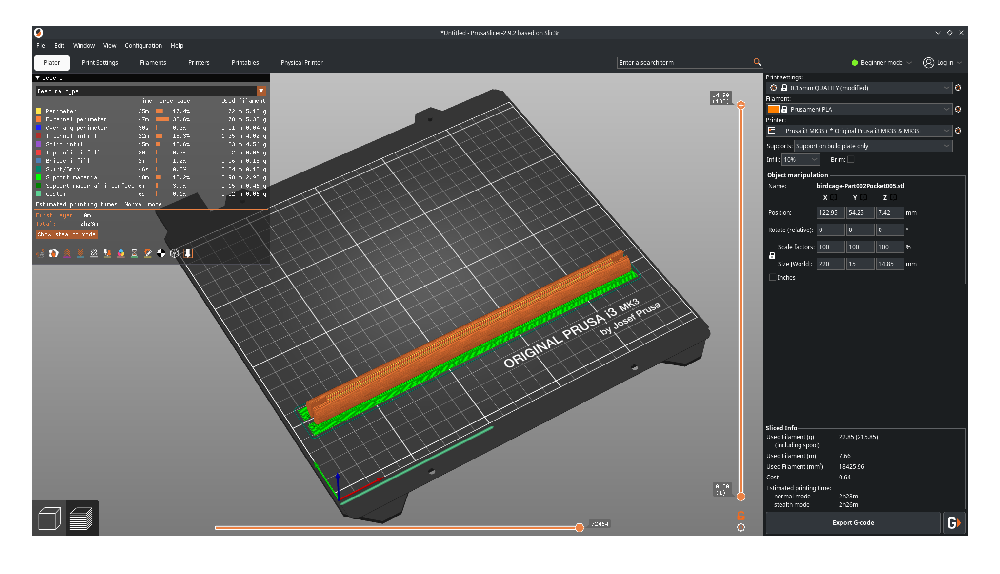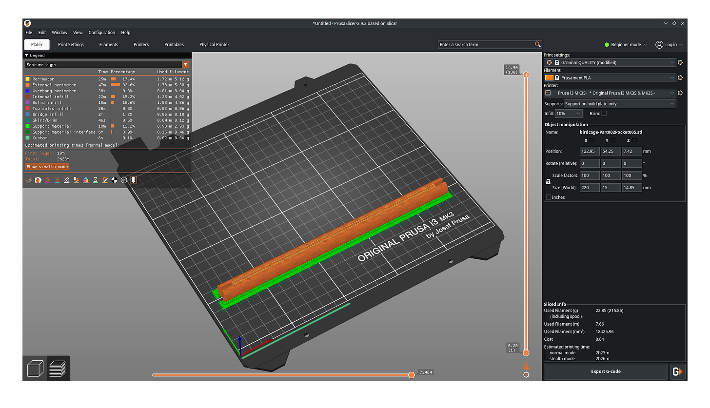 In the end, I chose to go the Prusa route, but the high prices put me off: after all, I’m just getting started and I do not need to make a huge investment in a “hobby” that may not last, so I got a second-hand, lightly-used Prusa i3 MK3S+ for a fraction of the price of a new one. And then the surprises started: the printer has zero network connectivity. This was a bit unexpected (I somehow assumed it’d offer local-only network printing), but in the end turned out to be great because this means that there is zero cloud garbage involved in the printing process. The printer just has an SD card slot and a USB port, so I plugged the latter into a computer running PrusaSlicer and… nothing. PrusaSlicer did not have any option to actually print to the physically-attached printer. Weird.