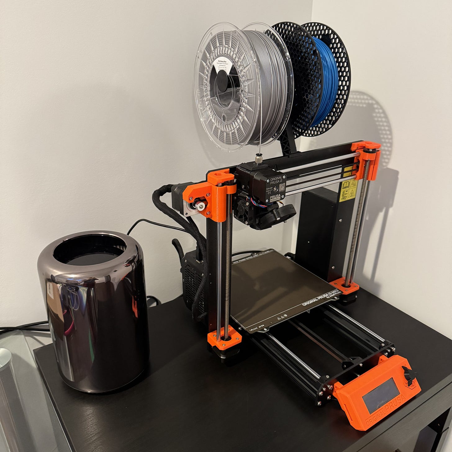 As it turns out, you need a print server to actually control the machine from its USB port. Researching this topic online will almost certainly convince you that you need OctoPi running on a Raspberry Pi in order to print. But… a Pi is just a computer, so whatever OctoPi does can also be done on a Linux machine—the Mac Pro I had already connected to the printer in the picture right above. And indeed that’s the case: once I installed OctoPrint, I could connect to the printer and drive it. (What’s more, it is possible to add a “physical printer” to the PrusaSlicer, but all PrusaSlicer will do is embed the print server’s web interface.)