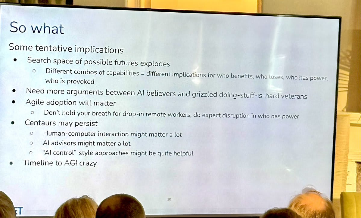 Sunday started out with Josh Achiam’s talk (again, he’s Head of Mission Alignment at OpenAI, but his views here were his own) about the challenge of the intelligence age. If it comes out, it’s worth a watch. There were a lot of very good thoughts and considerations here. I later got to have some good talk with him during the afterparty. Like much talk at OpenAI, it also silently ignored various implications of what was being built, and implicitly assumed the relevant capabilities just stopped in any place they would cause bigger issues. The talk acknowledged that it was mostly assuming alignment is solved, which is fine as long as you say that explicitly, we have many different problems to deal with, but other questions also felt assumed away more silently. Josh promises his full essay version will deal with that.