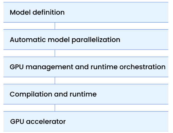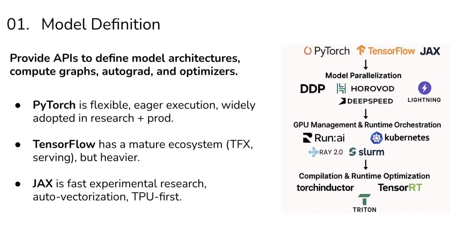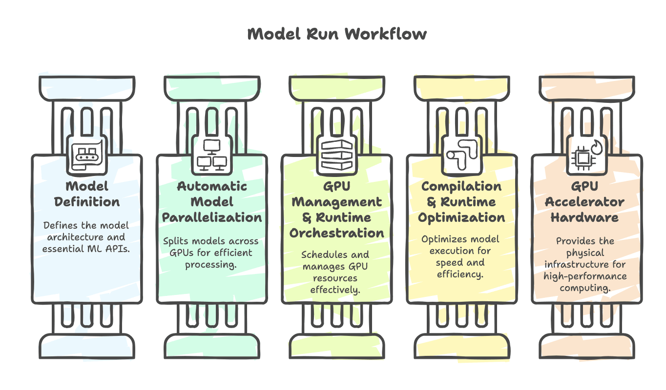 This is where most ML engineers start and spend most of their time: defining transformer layers, plugging them into PyTorch, relying on autograd and chaining together tensor ops.