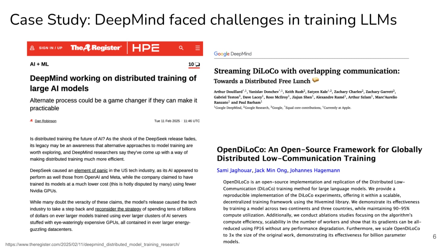 TLDR: DeepMind reported that even with thousands of GPUs, distributed training was stalling because a few slow nodes delayed global synchronization. In data-parallel training, the job waits for the slowest worker. Ray and Kubernetes help by managing elasticity (reassigning tasks when nodes fail) and scheduling (ensuring GPUs aren’t stranded in queues).