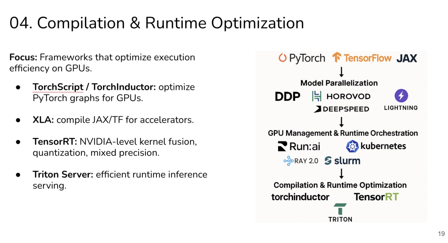 Compilers like TorchInductor fuse operations into larger kernels, and TensorRT quantizes models to FP16 or INT8 to save both compute and memory. Triton Server then orchestrates batching, so GPUs handle thousands of requests efficiently.