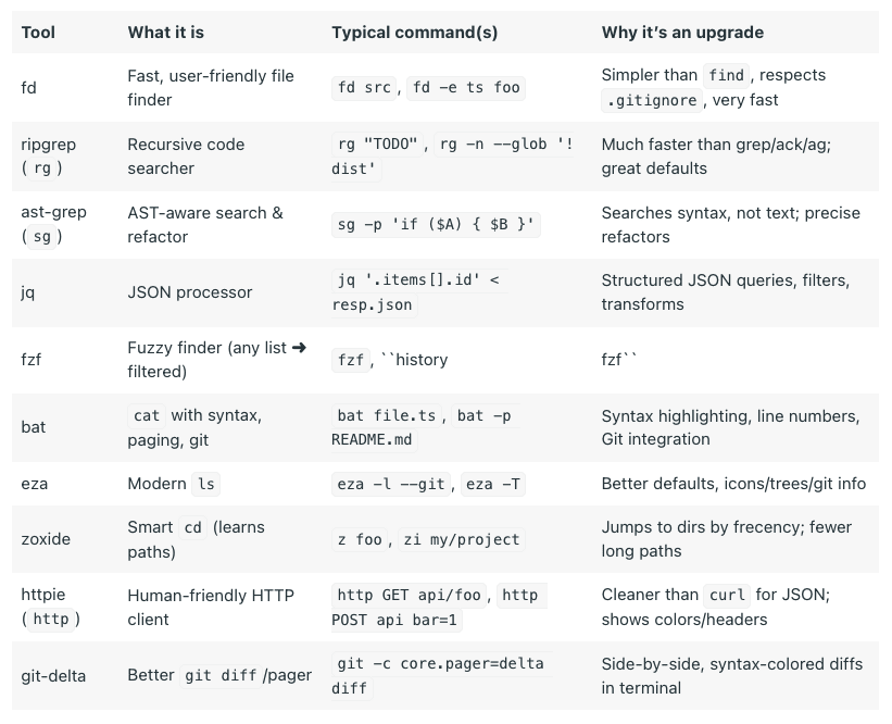 --- ## CLI Toolbelt Fast, user‑friendly tools Codex prefers when available. Install with your package manager (examples shown for Homebrew): ```bash brew install fd ripgrep ast-grep jq fzf bat eza zoxide httpie git-delta # Optional fzf keybindings $(brew --prefix)/opt/fzf/install --key-bindings --completion --no-bash --no-fish ``` | Tool | What it is | Typical command(s) | Why it’s an upgrade | | -------------- | ---------------------------------------- | ------------------------------------------------ | ------------------- | | fd | Fast, user‑friendly file finder | `fd src`, `fd -e ts foo` | Simpler than `find`, respects `.gitignore`, very fast | | ripgrep (`rg`) | Recursive code searcher | `rg “TODO”`, `rg -n --glob ‘!dist’` | Much faster than grep/ack/ag; great defaults | | ast-grep (`sg`)| AST‑aware search & refactor | `sg -p ‘if ($A) { $B }’` | Searches syntax, not text; precise refactors | | jq | JSON processor | `jq ‘.items[].id’ < resp.json` | Structured JSON queries, filters, transforms | | fzf | Fuzzy finder (any list ➜ filtered) | `fzf`, ``history | fzf`` | Fast fuzzy pickers; pairs well with `rg`/`fd` | | bat | `cat` with syntax, paging, git | `bat file.ts`, `bat -p README.md` | Syntax highlighting, line numbers, Git integration | | eza | Modern `ls` | `eza -l --git`, `eza -T` | Better defaults, icons/trees/git info | | zoxide | Smart `cd` (learns paths) | `z foo`, `zi my/project` | Jumps to dirs by frecency; fewer long paths | | httpie (`http`)| Human‑friendly HTTP client | `http GET api/foo`, `http POST api bar=1` | Cleaner than `curl` for JSON; shows colors/headers | | git-delta | Better `git diff`/pager | `git -c core.pager=delta diff` | Side‑by‑side, syntax‑colored diffs in terminal | Preferred defaults inside Codex - Use `rg` for searching code and logs; fall back to `grep` only if needed. - Use `fd` for finding files; fall back to `find` only if needed. - Use `jq` to parse/pretty‑print JSON from APIs and logs. - Use `httpie` for ad‑hoc API exploration; use `curl` for fine‑grained CORS/DNS tests. - Use `timeout` to avoid running commands indefinitely and tests actually finish - Use `git-delta` as it changes the reading order of diffs and can help with better code reads. ---Put guardrails, not a manual in AGENTS.md at repo root (and optionally per package). Codex (and other agents) use it as the predictable “what to run/how to verify” source. GitHub code review with @codex review also reads your AGENTS.md review rules. Keep it terse.