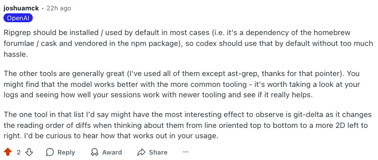 So I posted this table over at r/codex and seems to have gotten the attention of OpenAI staff and have added git-delta to the TOOLS.md from suggestions from Joshua (great suggestion!)