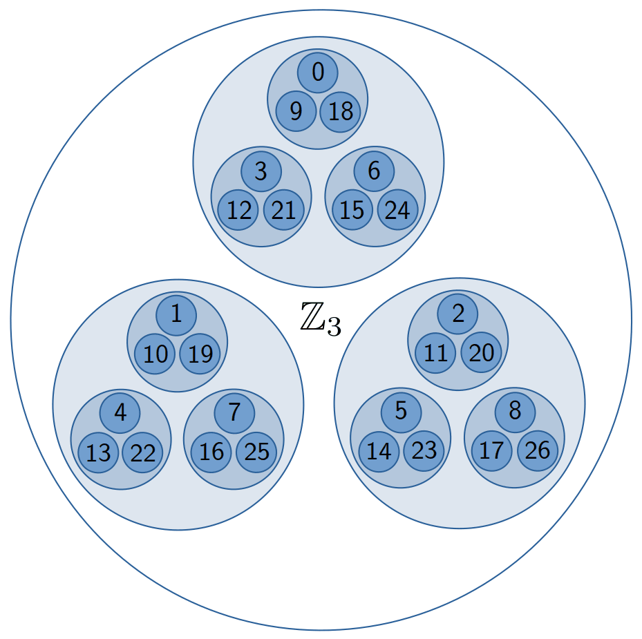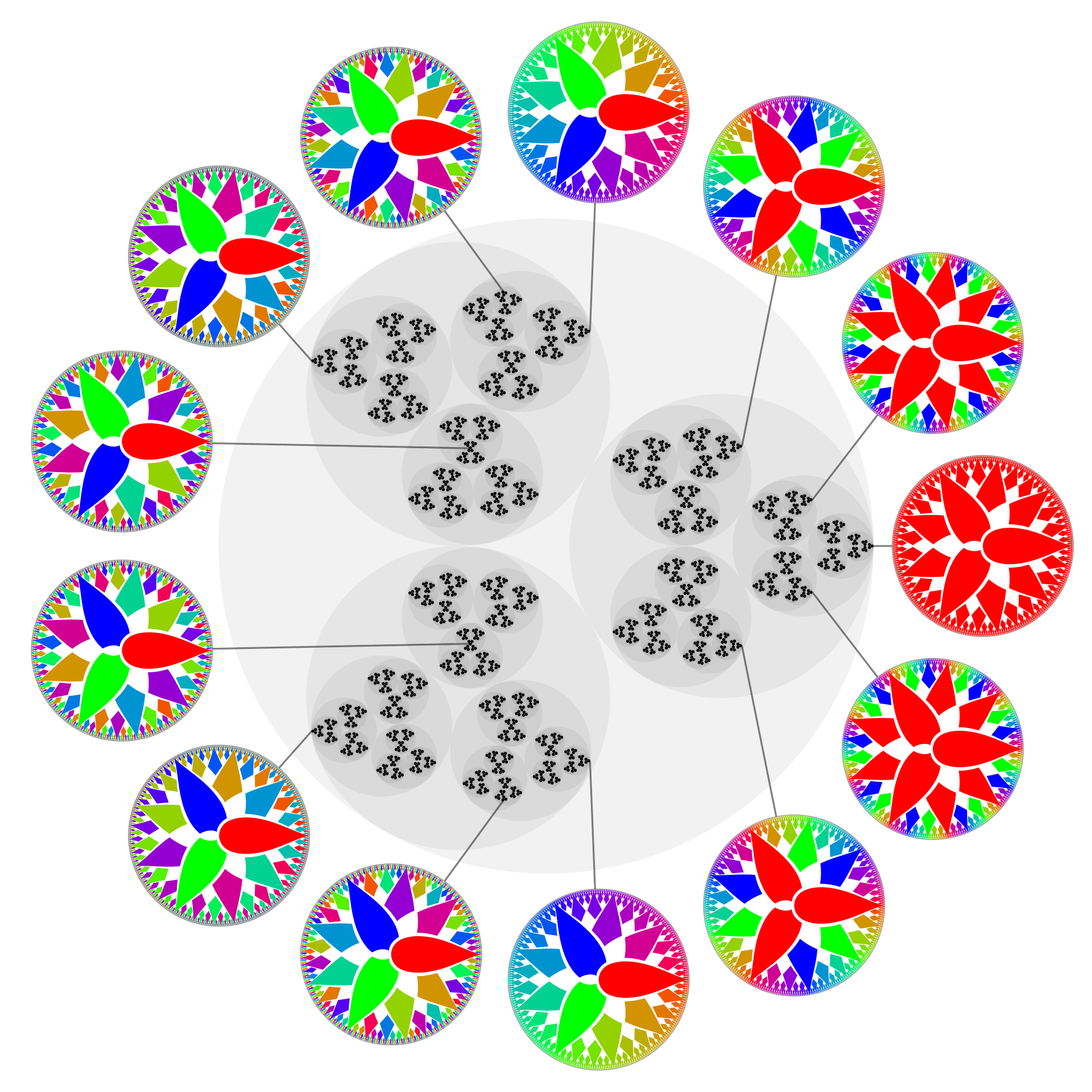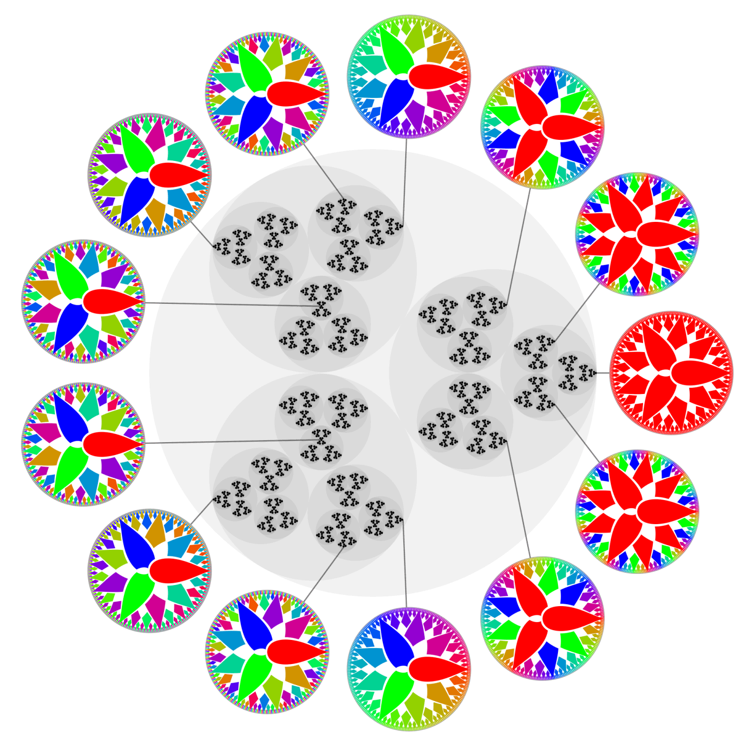 So far so good? Once you have a notion of “size,” you can move on to the idea of “distance.” Just define the “distance” between two numbers as the “size” of their difference. That totally works with the size you know and love, but when you pull out one of these other sizes, things get pretty weird. In our wacky new world, numbers are closer together if they are separated by higher powers of p, so 1 and 10 are closer than 1 and 4. If we now act like demented topologists and try to visualize this as an actual space, it’s a disturbing and confusing one where, for instance, all triangles are isoceles. My own way of visualizing this is that we’ve ripped the numbers out of their usual locations and placed them in a vast tree, like the tree of life or a family tree, organized by powers of p, and the “distances” in this tree are measured how many levels of branches you need to traverse to get from one number to another.