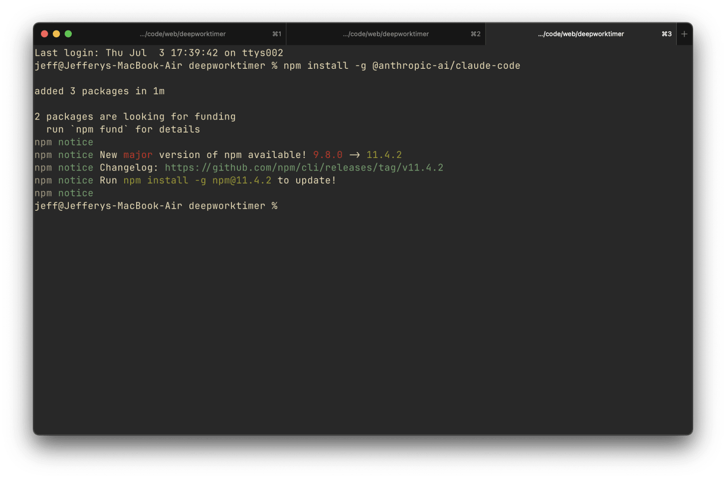 npm install -g @anthropic-ai/claude-codeMake sure you get a successful install.