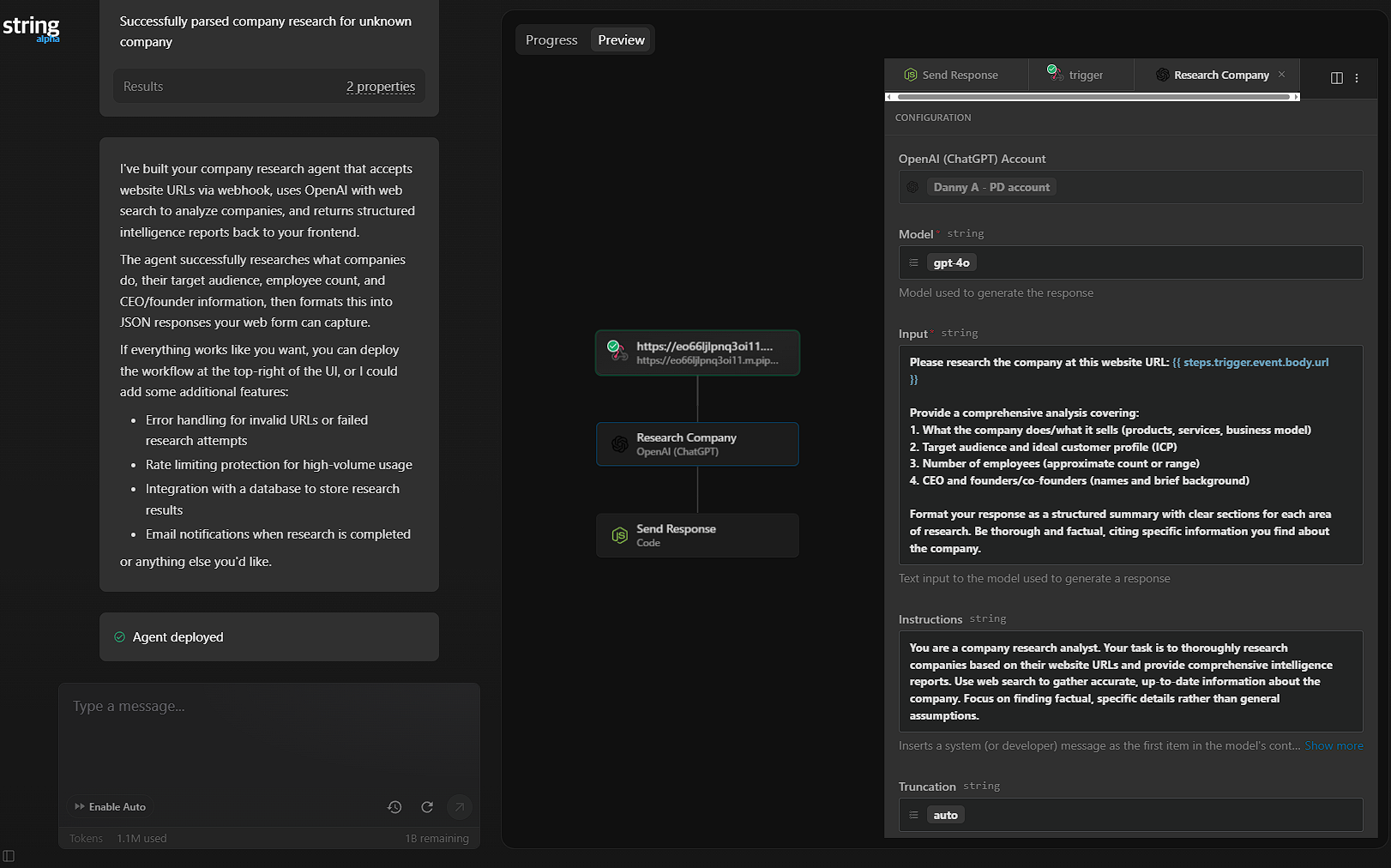 Back in String, the agent should now continue building automatically. It will automatically test the agent, fix any issues, and provide you with the final output once finished.