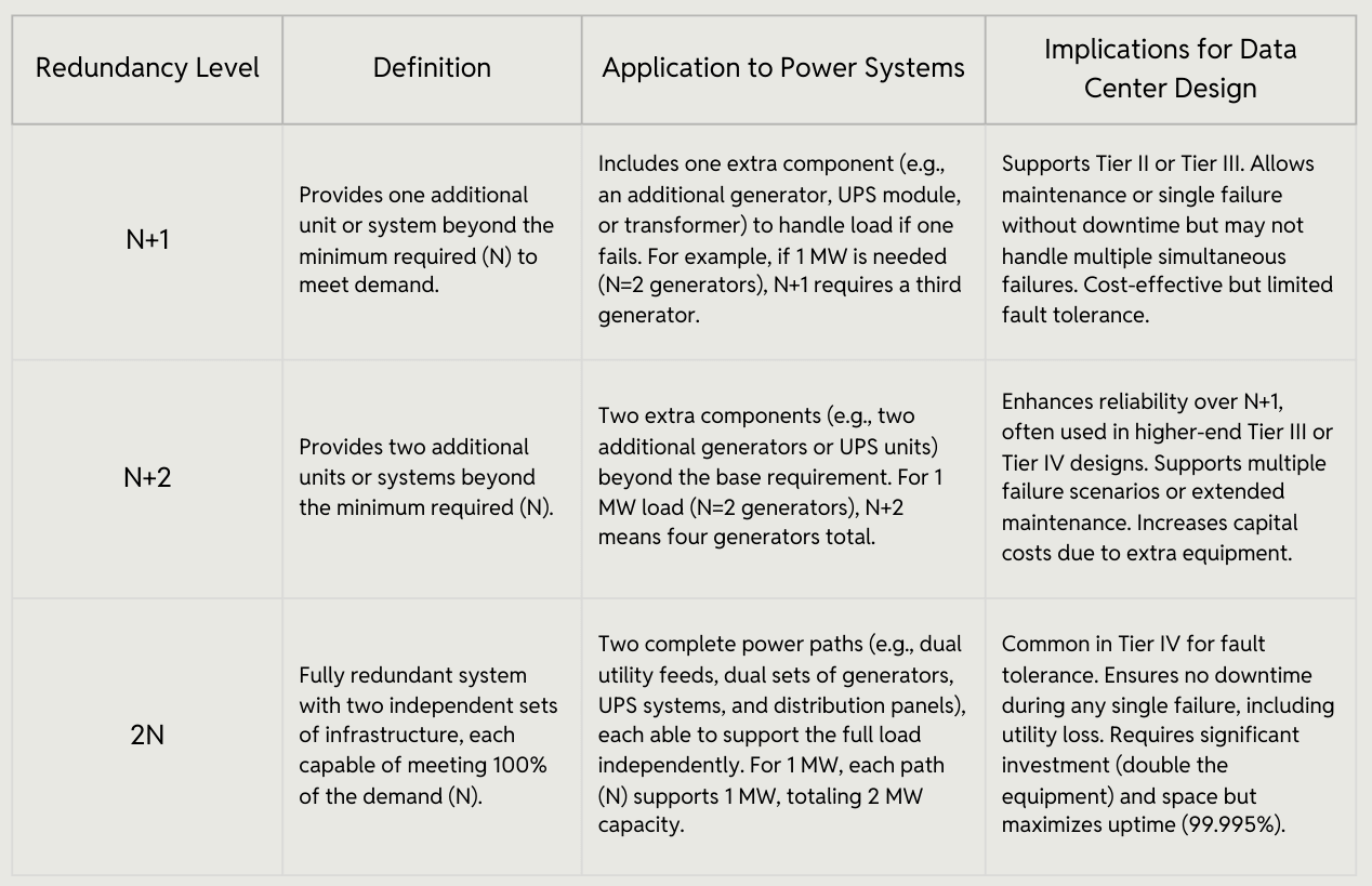 The redundancy rating system colloquially referenced among industry players (you probably hear Tier 3 and Tier 4 thrown around a lot) is the Uptime Institute’s Tier Classification, which categorizes data centers into four levels based on infrastructure resilience, including power systems: