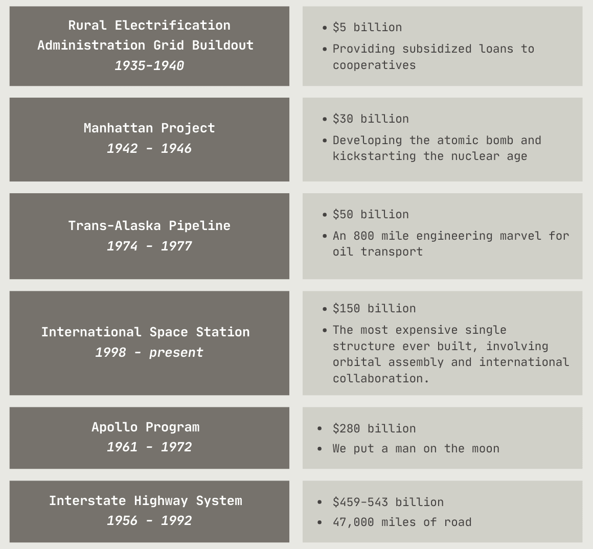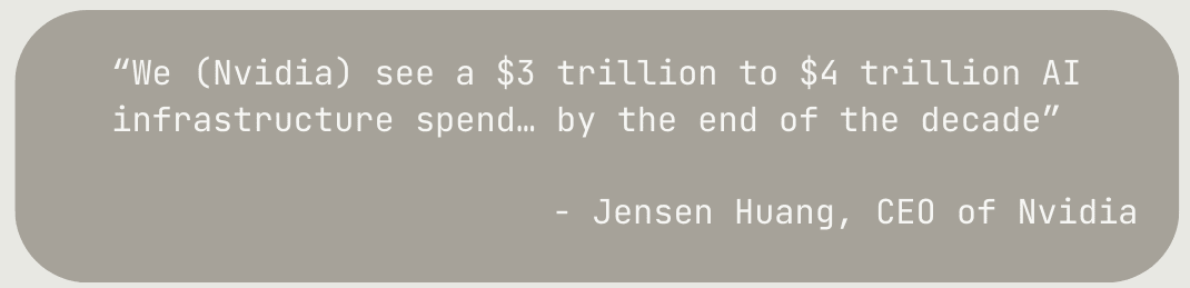 As our digital world continues to expand exponentially, it is crucial to understand the physical systems and supply chains that underlie it. Focus on building new infrastructure to meet the demand of digital growth is intense (and overdue) - Jensen Huang stated in his Q2 2025 remarks “We see a $3 trillion to $4 trillion AI infrastructure spend… by the end of the decade” from $600bn today, while Morgan Stanley forecasts $2.9tn in domestic datacenter spend through 2028. These numbers are so enormous you have to put them in perspective - that annualizes to $900bn of capex on datacenters per year by 2028 - compared to the entire S&P500’s 2024 capex of $950bn. Indeed, this infrastructure build dwarfs prior domestic infrastructure investments by orders of magnitude.