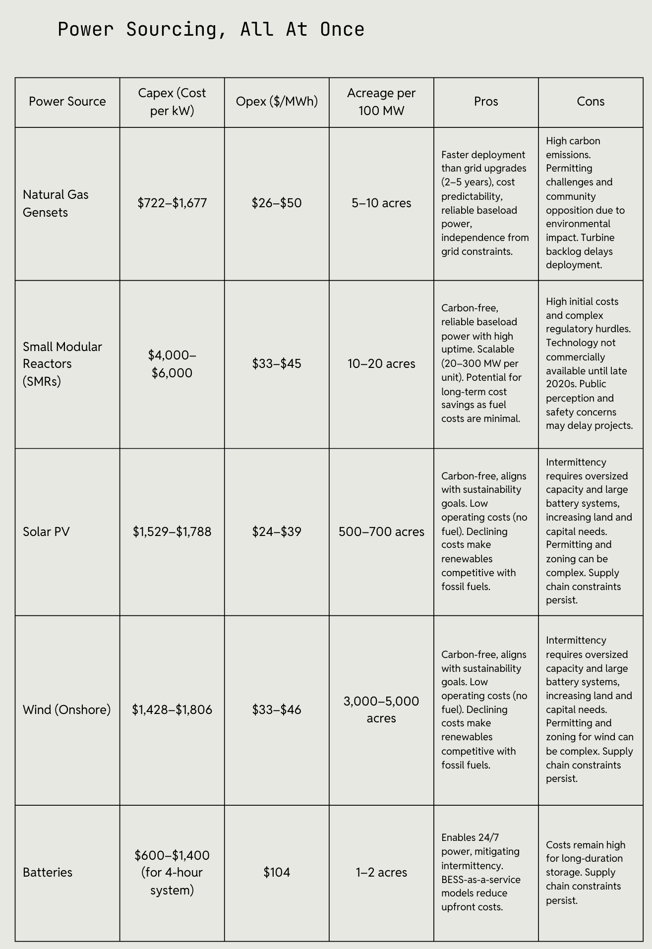 It’s worth noting location matters. To name a few examples, Ohio and Texas are BTM-friendly states; Texas recently passed SB6 to clarify how to bring BTM in ERCOT,while Virginia is also emerging as BTM-friendly with Green Energy Partners’ 641-acre SMR project. Here’s a breakdown of the primary power sources you’d consider when bringing your own power: