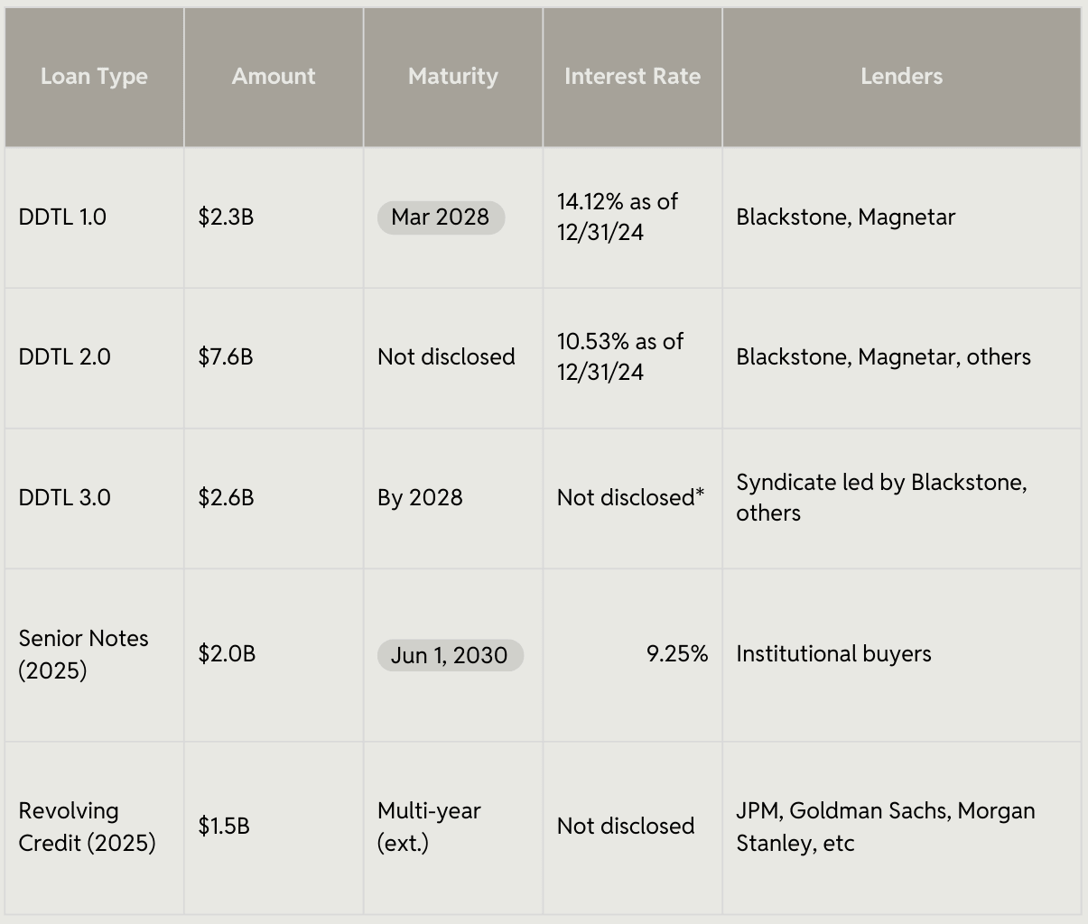 Equity returns in datacenter development range from 12-19+% levered IRR. Working up the capital structure, top private credit firms have stepped in as primary lenders, offering flexible debt solutions tailored to high-capex projects. Coreweave, perhaps the posterchild of leveraged datacenter development, offers a helpful glimpse into market financing terms as a publicly listed company: