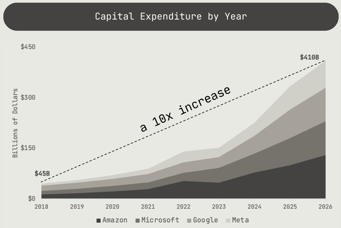 AHEM. How are you going to pay for everything we just talked about? The financing landscape for datacenters is evolving rapidly - hyperscalers historically relied on robust free cash flow to self-fund capex and stand as primary equity investors in their own sites. Cumulative capex has almost 10x’d since 2018 and the group are signaling continuous upward revisions in their capex commitments with each quarterly earnings cycle: