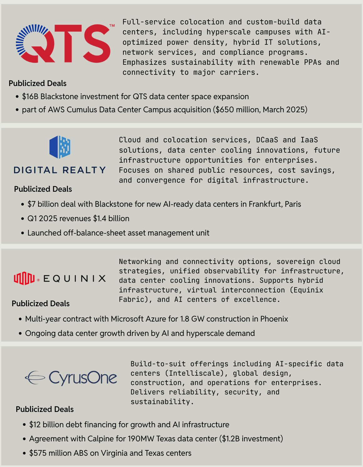 Equinix-Oklo (2024): $25M prepayment for 500 MW of SMR power by 2030; expanded partnerships with Vertiv and Liberty in 2025.