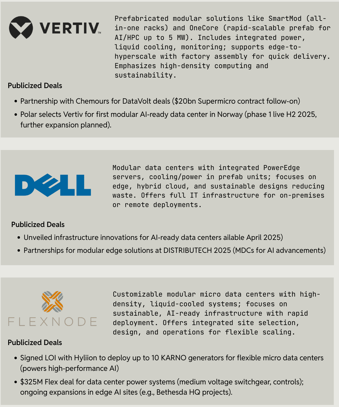These firms among many others (HPE, Schneider Electric) specialize in prefabricated modular data centers, assembled in factories and deployed on-site for faster, more flexible builds. They differ from large players by emphasizing edge and hybrid deployments, with containerized or rack-integrated designs.