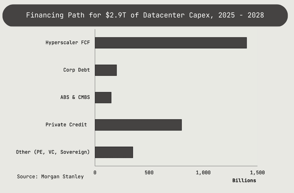 But, even while FCF is flowing - with cloud revenue growing 17-35% year-over-year across the above cohort as of Q2 2025 - the MAGs would be remiss not to take advantage of the capital markets hungry to finance builds, and are just now beginning to tap private credit markets in a meaningful way. Meta’s recently publicized $29 billion hybrid financing deal comprised of $26 billion in debt led by PIMCO and $3 billion in equity from Blue Owl Capital to support a massive project in Louisiana marked a pivotal turning point in hyperscalers turning to capital markets rather than paying out of FCF - in addition to marking the largest financing to date in the sector.