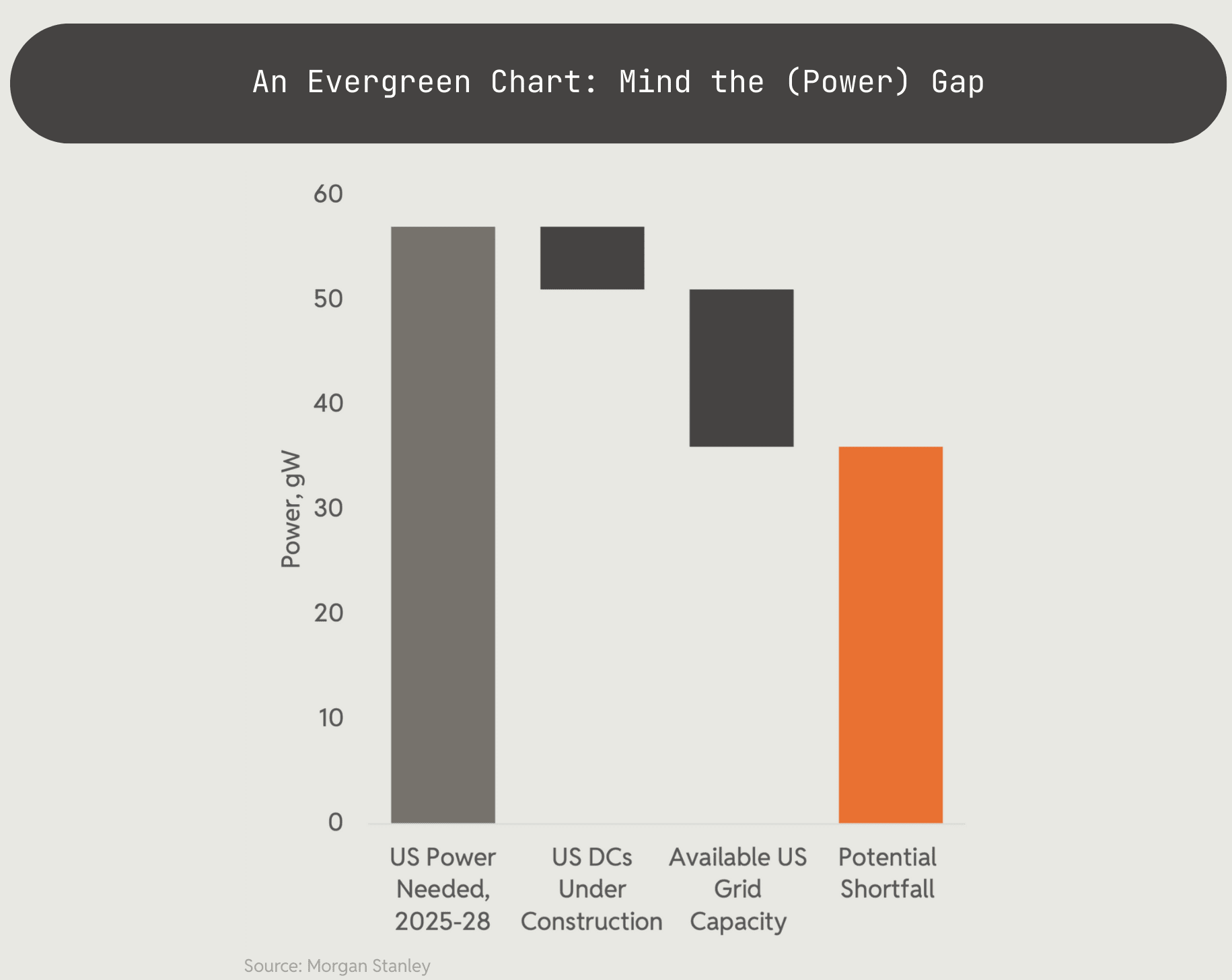 Power: With the latest rack scale systems commanding 600 kW/rack, reliable baseload power with redundancies is essential. As you know from our prior reports, the domestic grid’s power deficit is severe, to the tune of a 60 GW deficit by 2030 as forecasted by Morgan Stanley. Don’t want to deal with securing grid interconnect and dealing with utilities for a year? You may have some options: various iterations of behind the meter power, off-grid, or even newer instances of “be your own utility”- all of which we’ll get to in a bit.