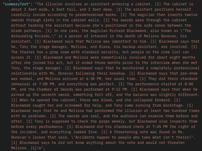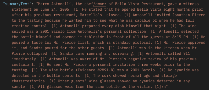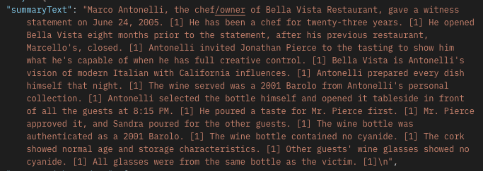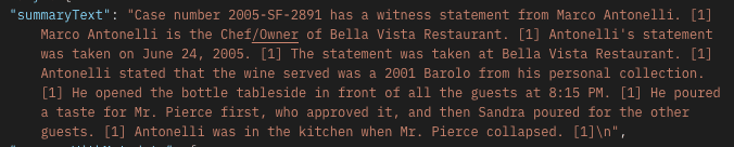 We can see that the summary correctly describes Marco Antonelli’s witness statement. Inside the response’s references section, we can see all the chunks that were returned by the search, showing the exact extract in the witness statement that includes the Barolo wine