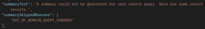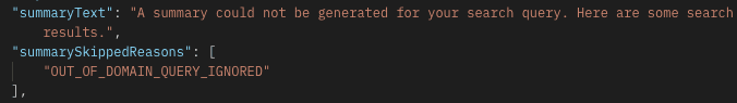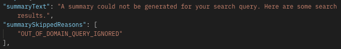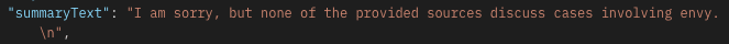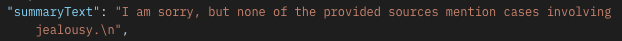 This response is received when Vertex determines that the question isn’t relevant to any data it has in its embeddings table and subsequently decides to ignore the query altogether. It’s basically a ‘will not answer’ from Vertex. Again, this takes some experimentation to learn how to phrase questions in a way that gets you results. This makes it a lot harder to use, especially if you’re piping the question directly through to Vertex from the user. An option to help with this, if you’re using another agent to access this tool, would be to create an agent tool that can take the user’s query and generate a better version of the query more likely to get results from Vertex.