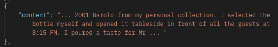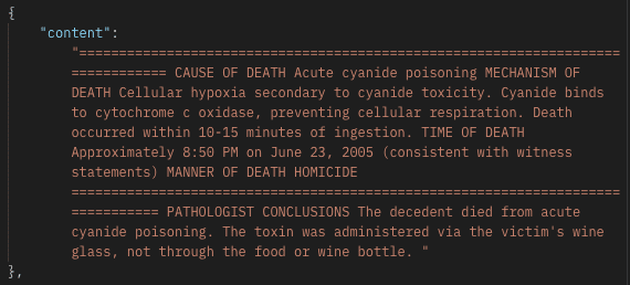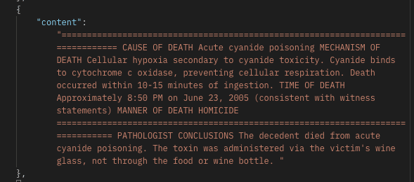 This likely means that the RAG system is smart enough to understand that Barolo is a wine, and so anything related to wine must be close in it’s semantic space. Vertex could also be returning neighbouring chunks when it finds a relevant one, however that cause of death report is in another document altogether.