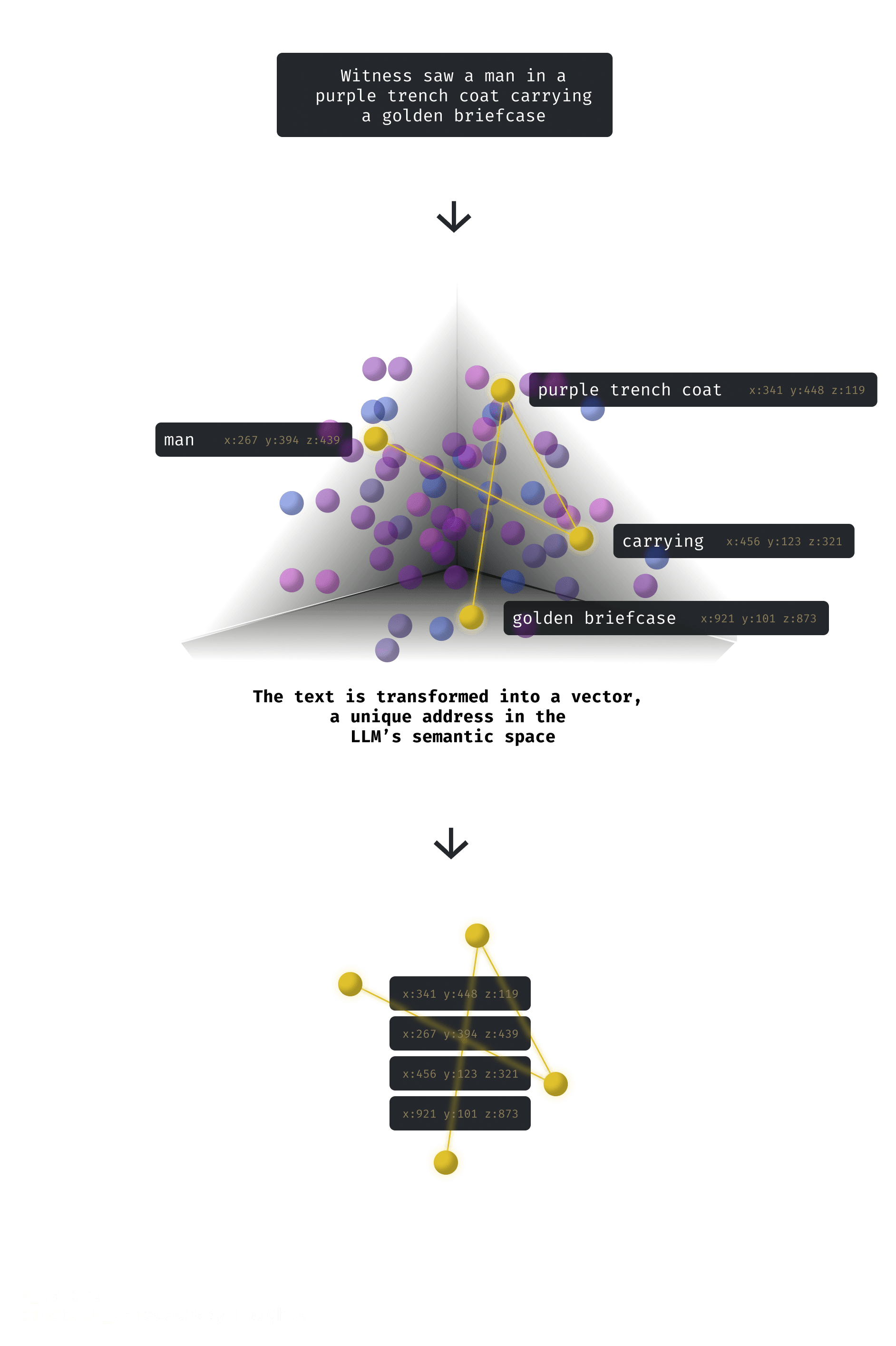 A vector can be thought of as the coordinates of that text within the model’s learned semantic space. Each dimension in the vector corresponds to a feature the model has learned about language during training. Together, those numbers act like an address in the model’s “brain,” showing where that piece of text conceptually lives relative to everything else it has ever seen.
