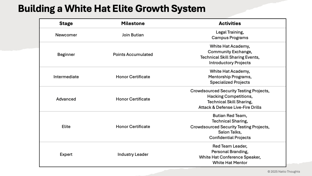 In 2021, the Butian Platform introduced the "Live-Fire Capability Map for White Hat Talent" (实战化白帽子能力图谱) as a reference standard for training white hat hackers (see below). The first of its kind in China, the map categorizes capabilities into three tiers: basic, advanced, and expert, progressing from foundational skills to highly specialized expertise.