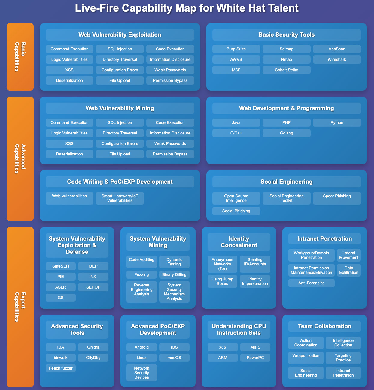 Basic capabilities encompass essential skills like web vulnerability exploitation and proficiency with security tools such as Burp Suite, Nmap, and Wireshark. Building on these foundations, advanced capabilities include web vulnerability discovery, programming languages (Java, PHP, Python, etc.), PoC/EXP development, and social engineering techniques. Expert capabilities represent the pinnacle of training, covering topics such as system-level vulnerability research, reverse engineering, tool weaponization, CPU instruction sets, advanced penetration testing, and collaborative team operations for complex tasks.
