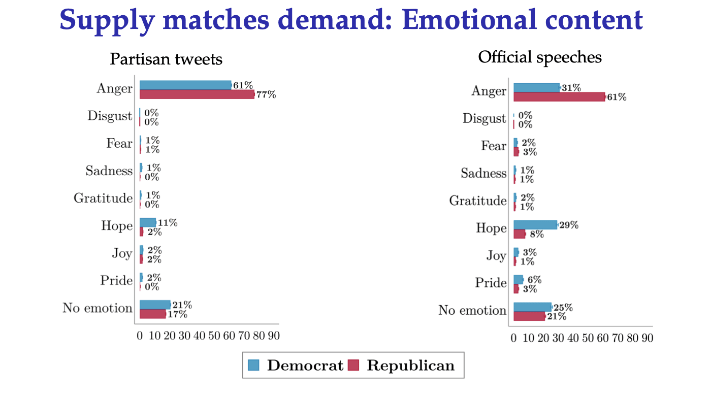 The same pattern was found on the supply side when the researchers examined the emotional content of the tweets from official Republican Party and Democratic Party accounts from 2013 to 2024 and in speeches and public interactions made by Trump, Biden, and Harris from 2023 to 2024. “Supply matches demand,” according to their findings. Anger dominated all other emotions in terms of social media messages from party officials and in many public statements from leaders, with hope emerging a bit more in the official output of Democrats last cycle.