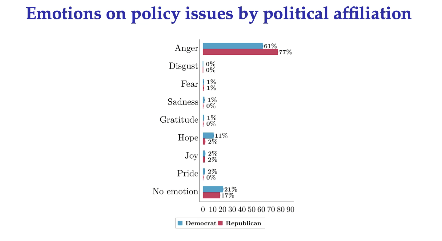 Economists and political scientists have done some fascinating work on the role of emotions in modern politics, looking at both the demand side (what people believe and want) and the supply side (what the leaders offer). For example, this recent academic paper explored the psychological content of social media postings from heavy partisan users from 2013 to 2024 (on issues including abortion, democracy, gender equality, gun control, immigration, taxes and inequality, climate, and trade), finding one emotion standing out way above all the others: anger.