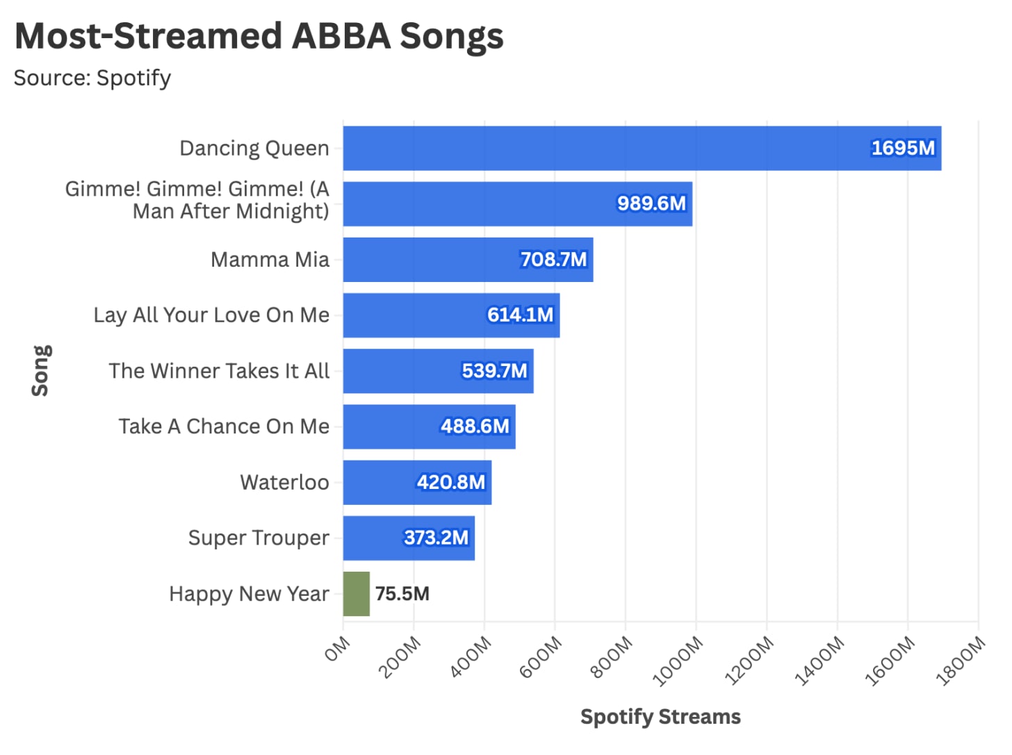 The common thread among these songs is the ease with which they can be distilled into 20 seconds of meme-ery. Consider ABBA's "Happy New Year," which is a relatively obscure title in the band's much-revisited discography. This tune is so irrelevant to ABBA's legacy that it did not make the cut for Mamma Mia or its sequel Mamma Mia: Here We Go Again. Despite appearing in over 2.3 million TikTok videos, this track currently ranks as ABBA's 26th most popular song on Spotify, receiving 4% of the streaming activity generated by "Dancing Queen."