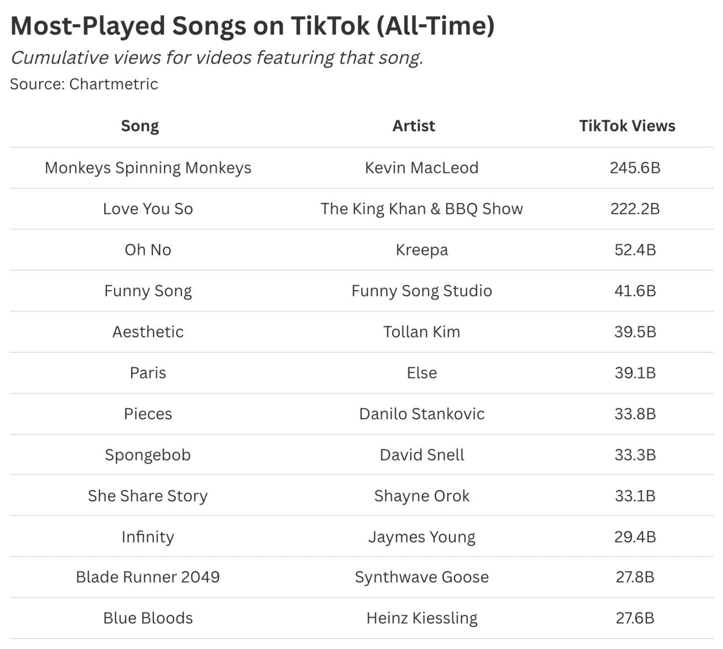 This phenomenon extends to the platform's most-played tracks of all time. Analyzing the songs with the highest cumulative views on TikTok reveals an unmistakable contradiction: collectively, these tracks have amassed nearly 800 billion views, yet you've likely never heard of them.
