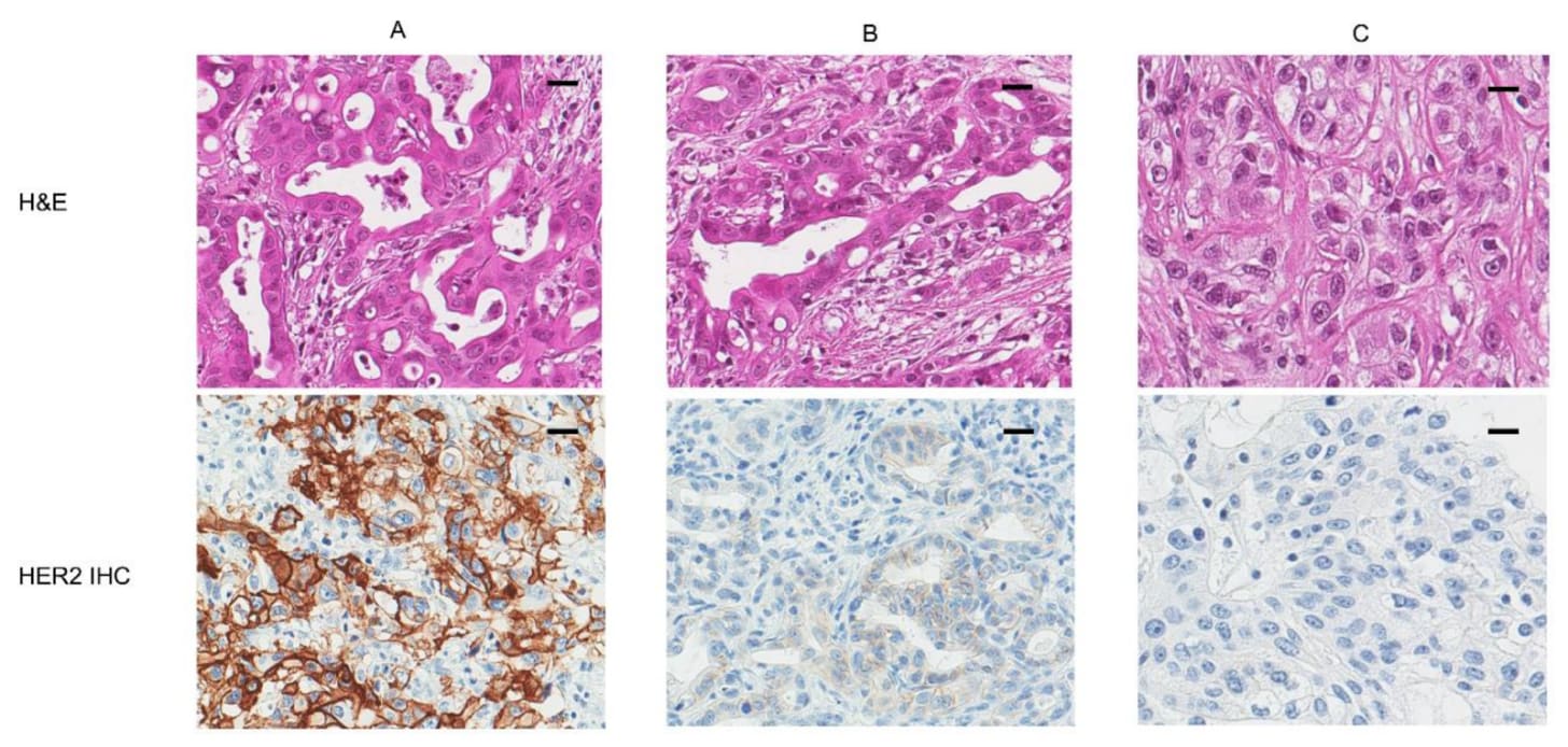 It is only in looking at the bottom row, where the patient’s tumor cells have been stained with an antibody specifically meant to bind to HER2, that a clinician would know that only patient A would respond to the drug, patient B may slightly respond, and patient C wouldn’t respond at all.