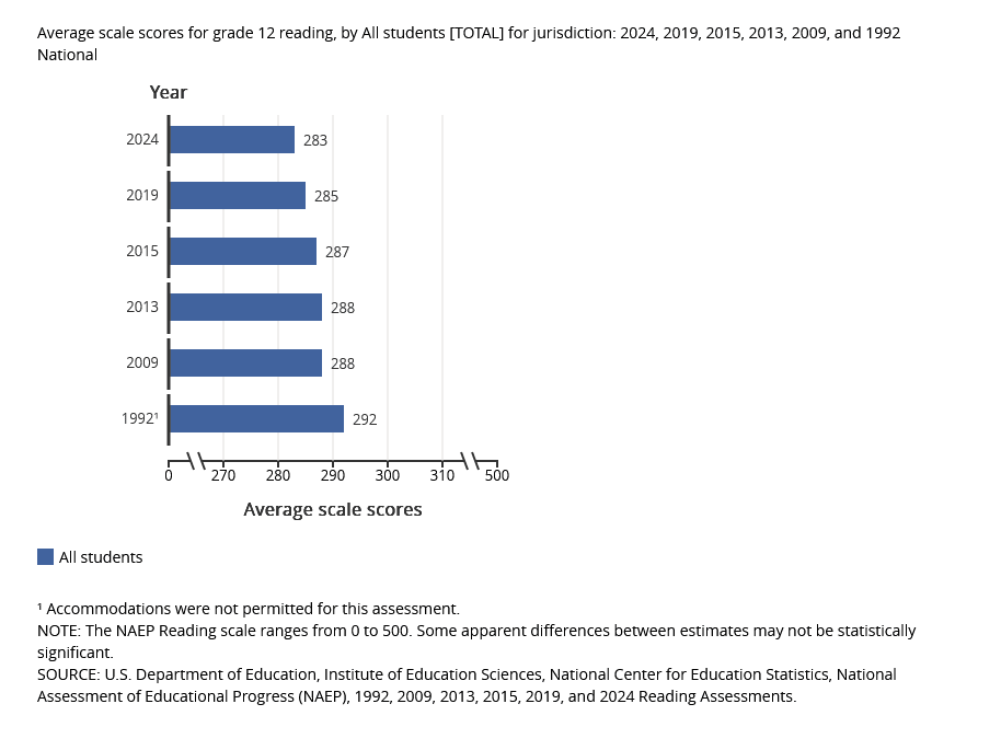 This 2024 article in Education Week details the decline in children’s reading stamina since 2019.Why Kids Aren’t Falling in Love With Reading Hint: It’s not just the screens. by Katherine Marsh