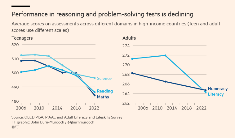Another thoroughly sourced paper from Charlotte Iserbyt (author of The Deliberate Dumbing Down of America) about the American government allowing Soviet influence in American education starting in the 1930s, detailing, among other things, American school’s implementation of curriculum that was developed with the aid of the Soviet government.This Financial Times article caused a bit of a stir when it reported on what appeared to be a near-global decline in human intelligence. The article is brief but includes a lot of sourced data. Here’s one of the many charts in the article, to give you an idea: