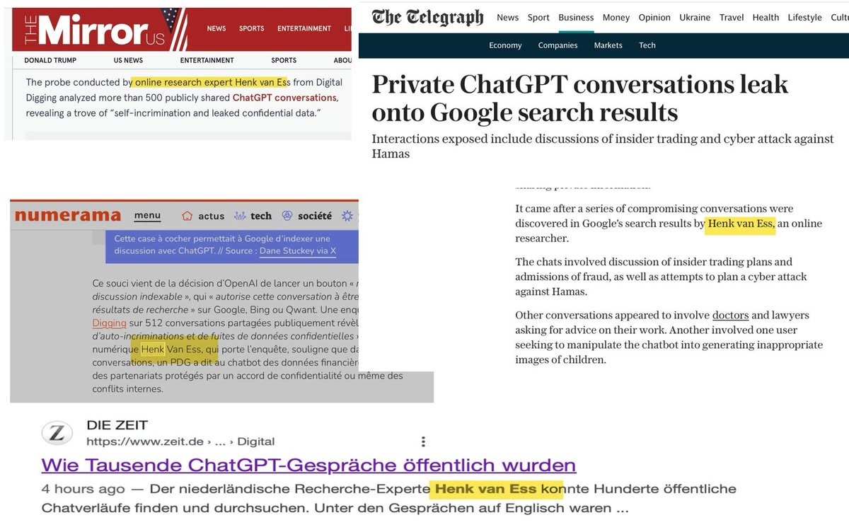 A new Digital Digging investigation, conducted with Belgian researcher Nicolas Deleur, has uncovered 110,000 ChatGPT conversations preserved via Archive.org's Wayback Machine—a digital time capsule OpenAI can break with a request to take the chats down, but they didn’t yet. I asked the director of the Wayback Machine, Mark Graham, to comment. Graham: “I can/will tell you we have not gotten, or honored any requests for (large scale) URL exclusion of "chatgpt.com/share" URLs. If OpenAI, the rights holder for material from the domain chatgpt.com, asked for the exclusion of URLs from the URL pattern chatgpt.com we would probably honor that request. However, they have not made such a request”