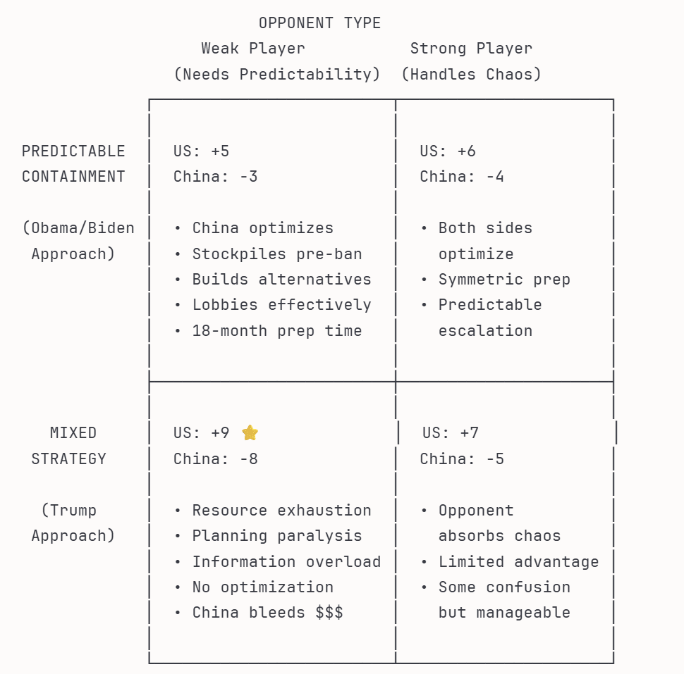 5. Trump’s chaos exploits this asymmetry (strong player benefits from unpredictability)