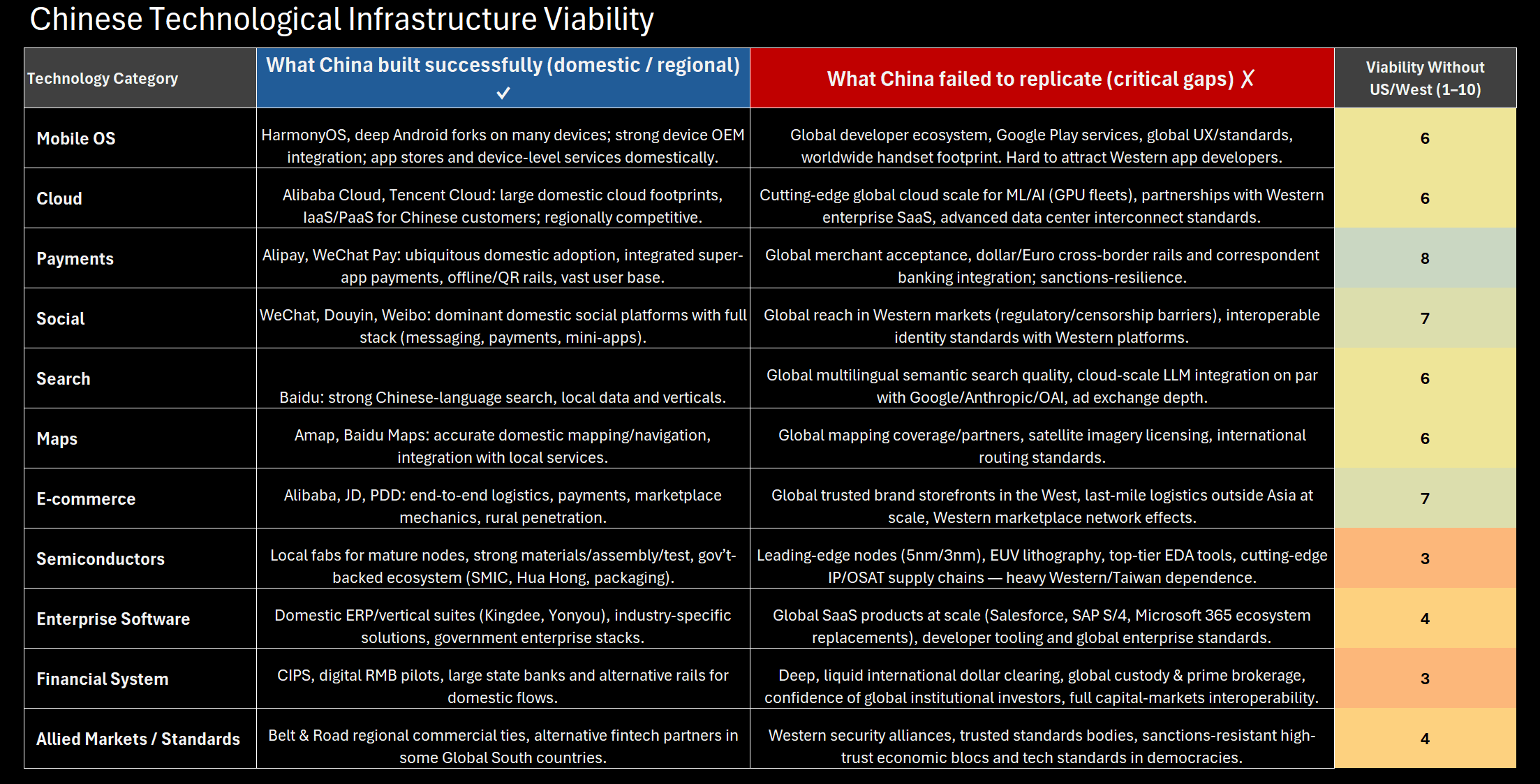 3. China prepared for this (15 years of alternative infrastructure) but failed on what matters (chips, finance, alliances)