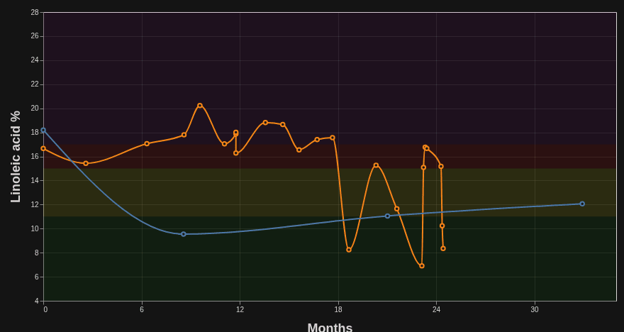One hypothesis, of course, is that Coconut has depleted her adipose linoleic acid much farther than I have. She has taken various OmegaQuant Complete tests, so we actually have a pretty decent comparison between her numbers and mine: