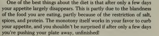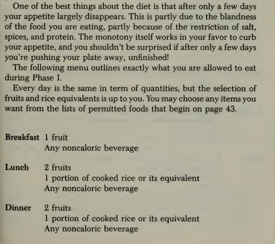 The book is a pretty typical diet book even by modern standards. It presents the rice diet as a revelatory, unique, and amazing solution that WORKS FOR EVERYBODY if they will just fucking stick to the plan (ominous foreshadowing is ominous).