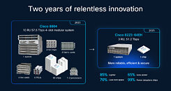 - Scalable without Compromise: The 8223 offers industry-leading bandwidth and the highest density of any fixed routing system in the industry. The only fixed routing system featuring 64 ports of 800G, the 8223 offers unmatched routing performance capable of processing over 20 billion packets per second and scaling up to 3 Exabits per second. It also features 800G coherent optics support, enabling data center interconnect and metro applications reaching up to 1000 km. With the P200's deep buffering capabilities, the new routing systems can absorb massive traffic surges from AI training, maintaining performance and preventing network slowdowns.