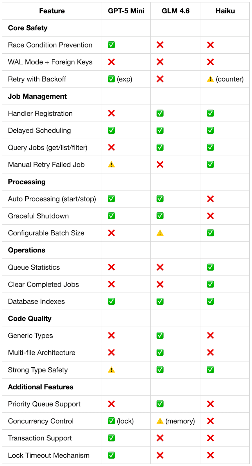 Haiku generated the entire code in ~3 minutes at $0.08. The code had the most features: stats, retry, job clearing, and database indexes. It was the only model to implement getStats() and clearCompleted() methods (practical housekeeping features that developers actually want in production). The implementation used clear method naming with good code documentation.