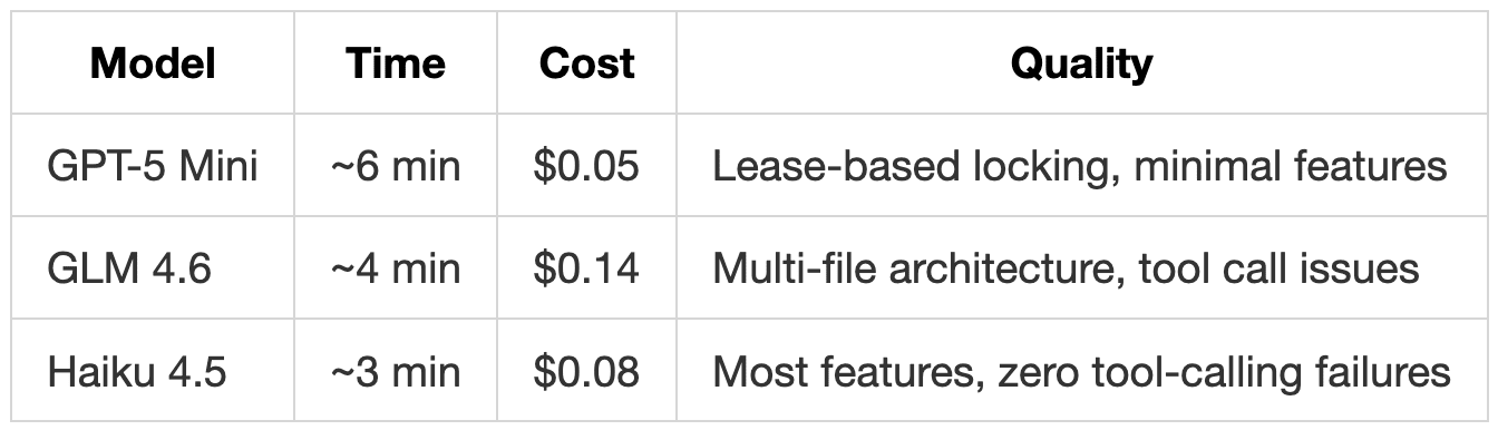 TL;DR: GPT-5 Mini implemented lease-based locking and delivered the strongest concurrency safeguards (6 min, $0.05). Haiku 4.5 was fastest with the most features and zero tool-calling failures (3 min, $0.08); GLM-4.6 produced multi-file architecture but required disabling reasoning mode for tool calls (4 min, $0.14).