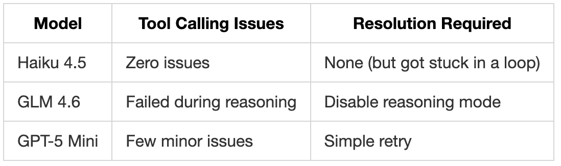 GLM 4.6’s reasoning mode doesn’t work reliably with tool calling. You have to turn off reasoning to make tool calling work. Haiku had zero tool-calling failures across all tests.