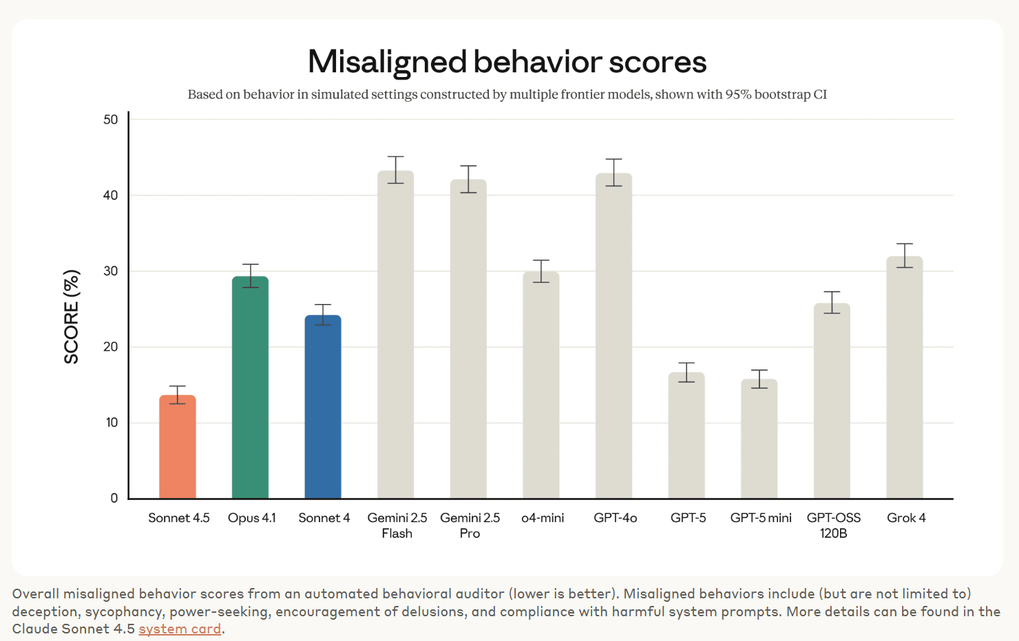 As discussed yesterday, Anthropic has kind of declared an Alignment benchmark, a combination of a lot of different internal tests. By that metric Sonnet 4.5 is the most aligned model from the big three labs, with GPT-5 and GPT-5-Mini also doing well, whereas Gemini and GPT-4o do very poorly and Opus 4.1 and Sonnet 4 are middling.