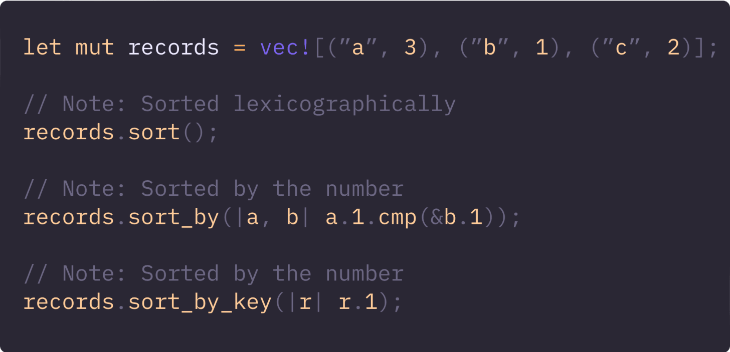 Sorting APIs leverage Ord by default, or accept comparators for custom logic.