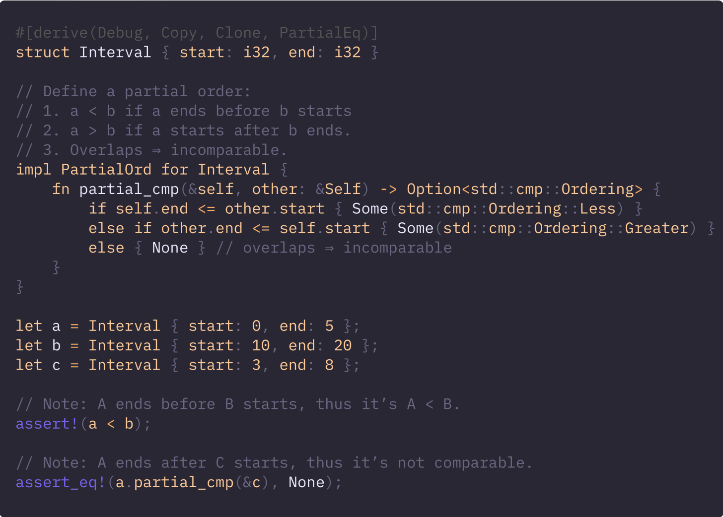 Sometimes, incomparability is the correct model: In Rust’s type system, this concept shines through traits like PartialOrd, where values can remain incomparable to accurately represent scenarios lacking a total order.