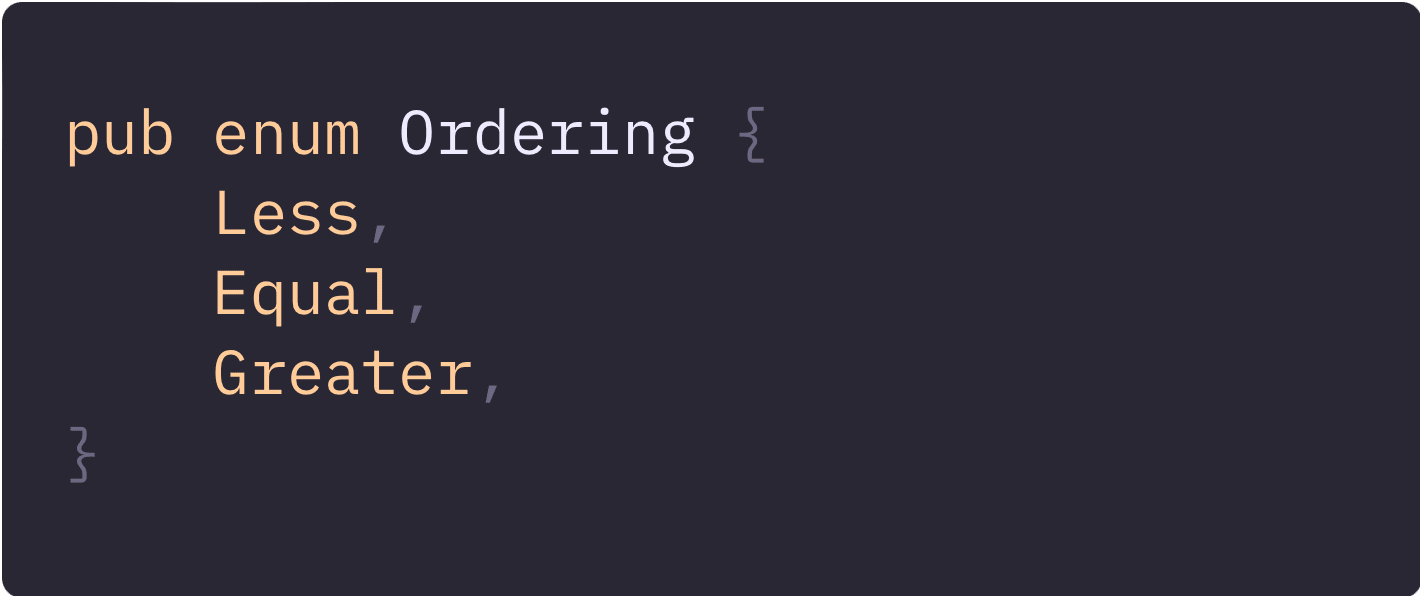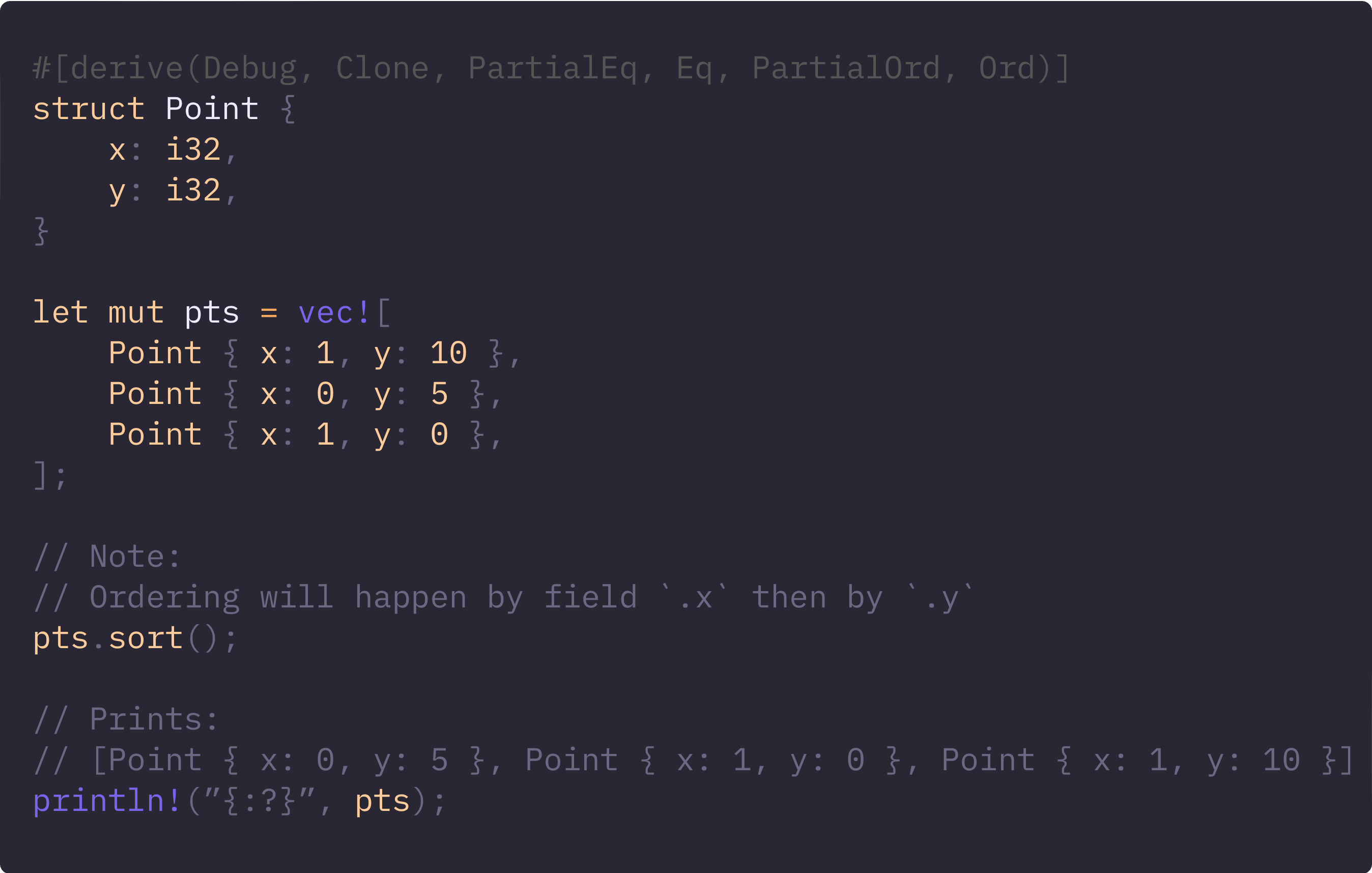 Ord implies Eq and provides a total order — it’s required by sorted collections like BTreeMap / BTreeSet and by sort() itself.